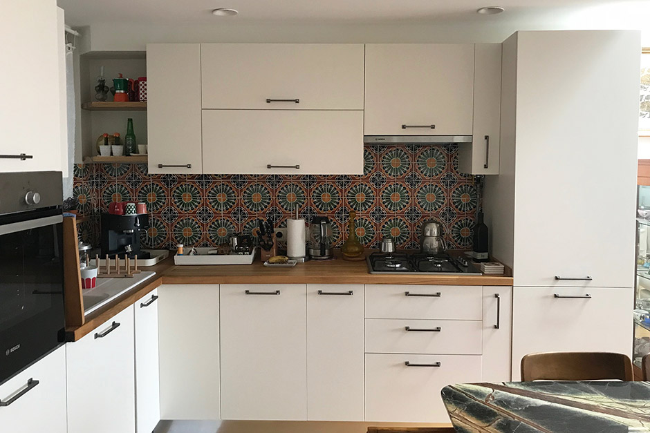 Since the color of the countertops, cabinets and the appliances can’t be changed, you can add in other colors by getting some statement tiles on the walls. Tiles are a great idea to use in the kitchen because the heat and smoke of the kitchen cause discoloration of the painted walls. The aroma of the food also gets absorbed in the walls, causing a certain smell to last a long time. Tiles don’t cause any discoloration and don’t absorb anything.