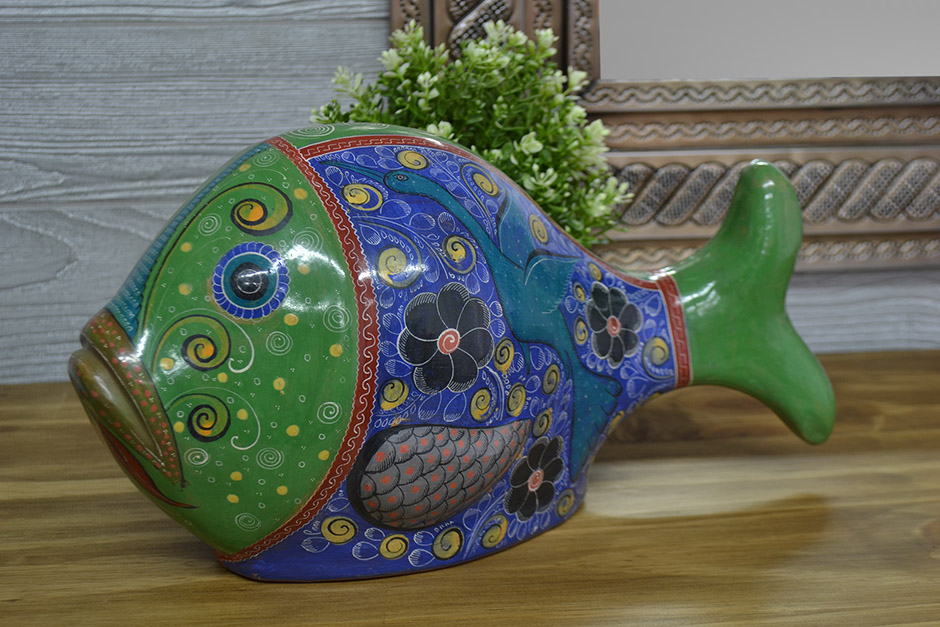 Master Artisan, Arnulfo Vazquez, produces one-of-a-kind originals for La Fuente Imports. One of the most notable features of his art is how the pieces are painted in colorful, playful designs. These designs pair flora and fauna with complex geometric shapes, pre-Hispanic borders, and abstract themes including the mythical Nagual (a human who can transform into an animal, often a jaguar). Farmers tending their crops, seasonal celebrations, and observances of life and death are also among the subjects depicted. On canvas, Arnulfo's artwork exhibits an even more substantial and breathtaking aura. His designs are visible in their entirety, unhindered, and pop with colors that cannot be achieved on clay.
