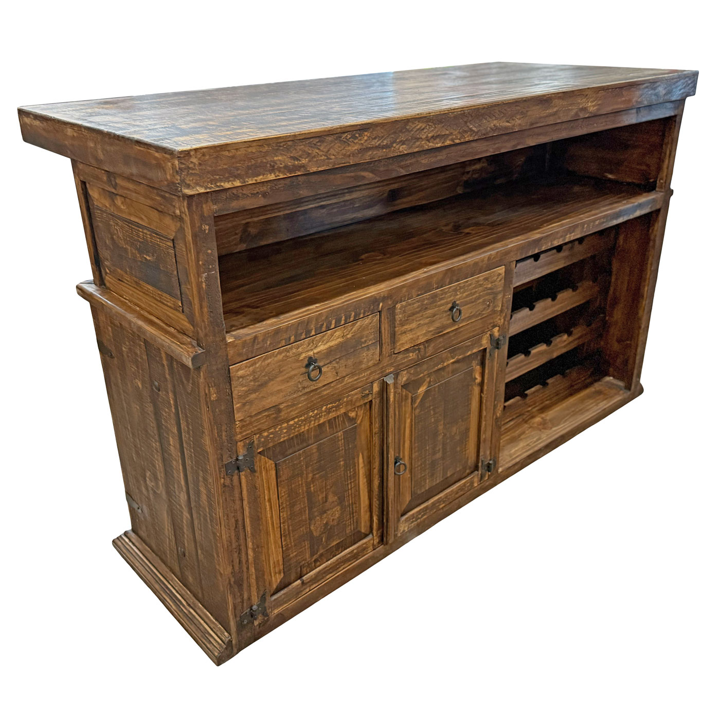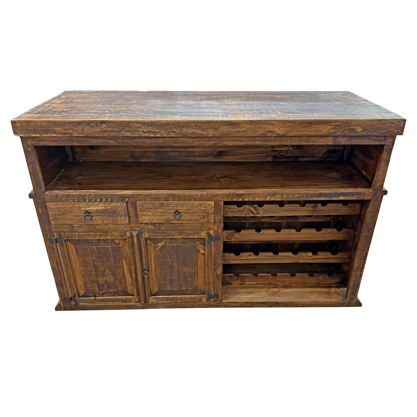 Wine racks, drawers, shelving, and even a two-door cabinet give you all the space you need to store your drink-mixing products in our expertly-made Ranch Bar. The solid pine has a dark, distressed finish that is durable and long lasting. Hand-forged iron accents and an iron foot rest round out its rustic design.