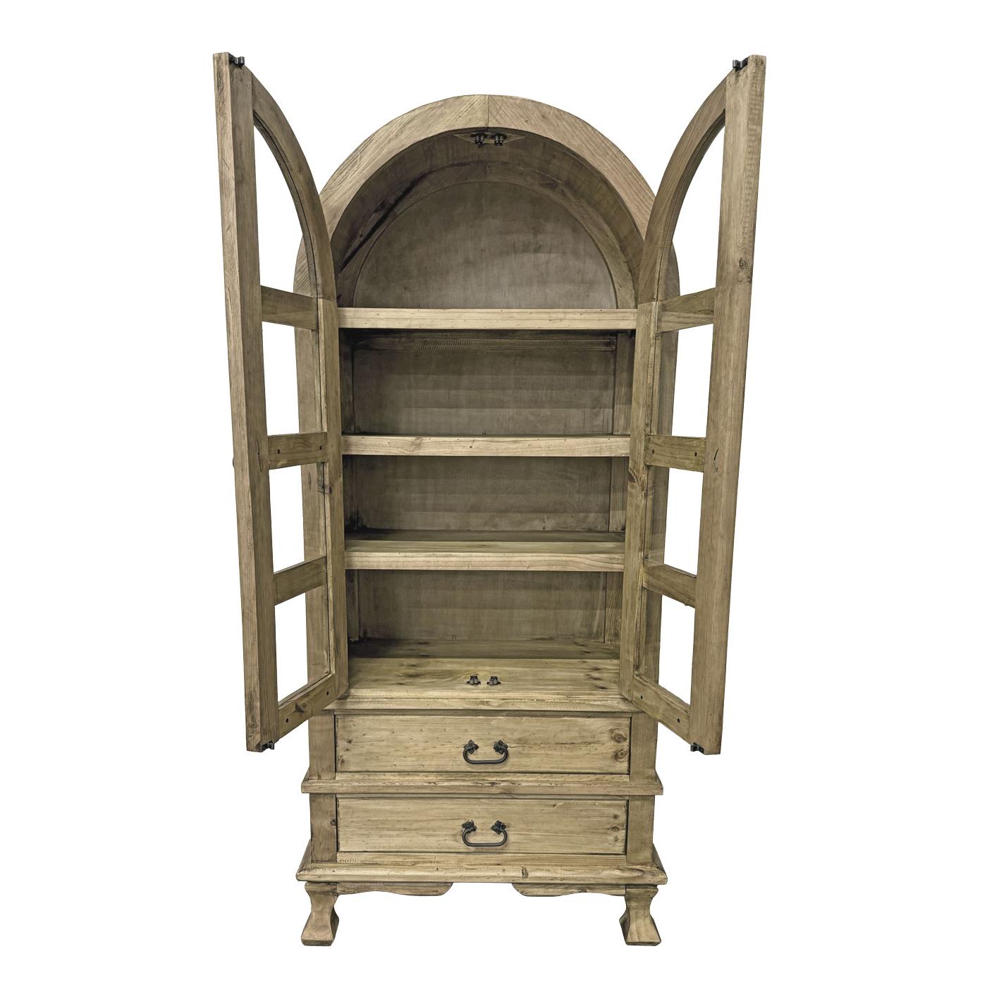 Our attractive Arched Top Cupboard has a classic southwestern style with plenty of available storage space for personal effects. The glass-paneled doors will keep your dishes, books or collectibles dust-free. The iron hardware gives it a rustic look that blends well with most decor. The two bottom drawers provide extra space for items less worthy of display. Its sturdy construction can be used in any room for storage or display. Skillfully handmade in Mexico, you will fall in love with the solid pine construction of our Arched Top Cupboard. Please Choose an Item