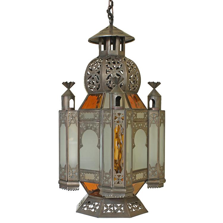 Enjoy the light peeking from the hand punched tin and frosted glass on this beautiful Cathedral Lantern. The frosted panels allow the light to softly filter through for a calming effect from every angle. The lantern features four decorative side towers with orange glass inserts that glow brightly around the center space. Hang one in any room of your home for a unique decorative lighting effect. Please Choose an Item
