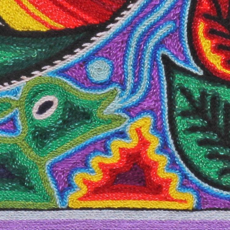 This beautiful, one-of-a-kind yarn painting was made by pressing thin strands of acrylic yarn into natural beeswax spread over a wooden board. Yarn art is made in limited quantities by the Huichol and Tepehuano people of southwestern Mexico. On the back of each painting is a description of the work, written in Spanish by artist Felix Bautista Ramos.