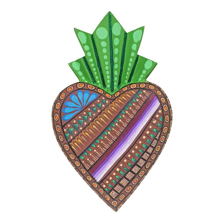 Handmade in the Zapotec village of San Martin, Oaxaca, these beautifully painted wooden hearts reflect the cultural fusion of the artists. Highly detailed with a semi gloss finish, each of these gorgeously carved hearts is adorned with delicate "grecas" like those found at the Zapotec palace of Mitla. The grecas, a series of repeating geometric designs, symbolize pre-Columbian gods like Quetzalcóatl, Tláloc or Cosijo, essential elements like the sun, rain or lightning, and elements of humanity like fertility or knowledge. They also symbolize universal consciousness, and as such, represent the bond between human existence and the divine in pre-Columbian Mexico. It is the shape of the sacred heart, in turn, with it's crown and flames, that demonstrates the fusion of indigenous and Catholic beliefs. Please Choose an Item