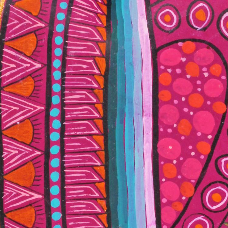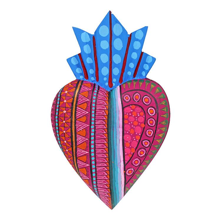 Handmade in the Zapotec village of San Martin, Oaxaca, these beautifully painted wooden hearts reflect the cultural fusion of the artists. Highly detailed with a semi gloss finish, each of these gorgeously carved hearts is adorned with delicate "grecas" like those found at the Zapotec palace of Mitla. The grecas, a series of repeating geometric designs, symbolize pre-Columbian gods like Quetzalcóatl, Tláloc or Cosijo, essential elements like the sun, rain or lightning, and elements of humanity like fertility or knowledge. They also symbolize universal consciousness, and as such, represent the bond between human existence and the divine in pre-Columbian Mexico. It is the shape of the sacred heart, in turn, with it's crown and flames, that demonstrates the fusion of indigenous and Catholic beliefs. Please Choose an Item