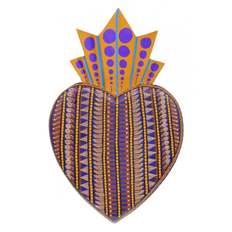 Handmade in the Zapotec village of San Martin, Oaxaca, these beautifully painted wooden hearts reflect the cultural fusion of the artists. Highly detailed with a semi gloss finish, each of these gorgeously carved hearts is adorned with delicate "grecas" like those found at the Zapotec palace of Mitla. The grecas, a series of repeating geometric designs, symbolize pre-Columbian gods like Quetzalcóatl, Tláloc or Cosijo, essential elements like the sun, rain or lightning, and elements of humanity like fertility or knowledge. They also symbolize universal consciousness, and as such, represent the bond between human existence and the divine in pre-Columbian Mexico. It is the shape of the sacred heart, in turn, with it's crown and flames, that demonstrates the fusion of indigenous and Catholic beliefs. Please Choose an Item