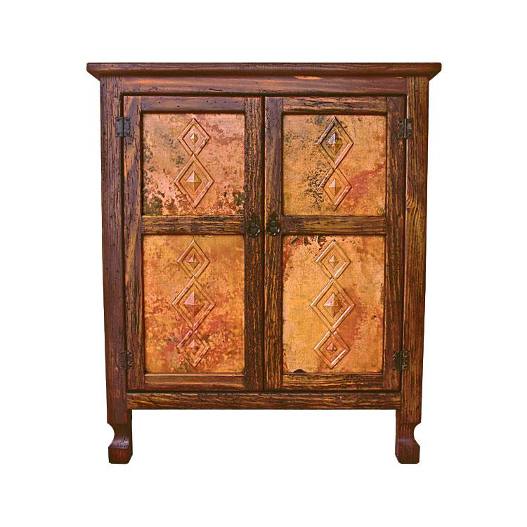 This cabinet features two large doors with copper panels and rustic hardware; and two shelves inside for ample storage space. Use the cabinet storage to keep everyday items safe and secure. This beautiful and functional cabinet will add much needed storage space and style to any room in your home.