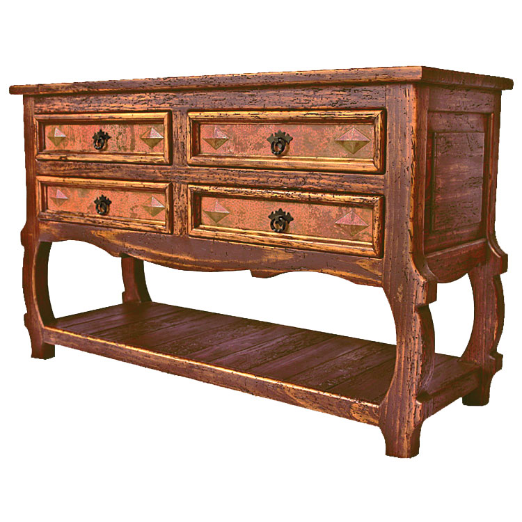 This console is versatile enough to work as a table or television center anywhere in your home. The console features four storage drawers with front facing copper panels and rustic hardware. This table also features a bottom shelf for additional storage. Use the drawers and shelf to eliminate clutter and keep your entertainment accessories organized. This table is sure to add style and beauty to any room in your home.
