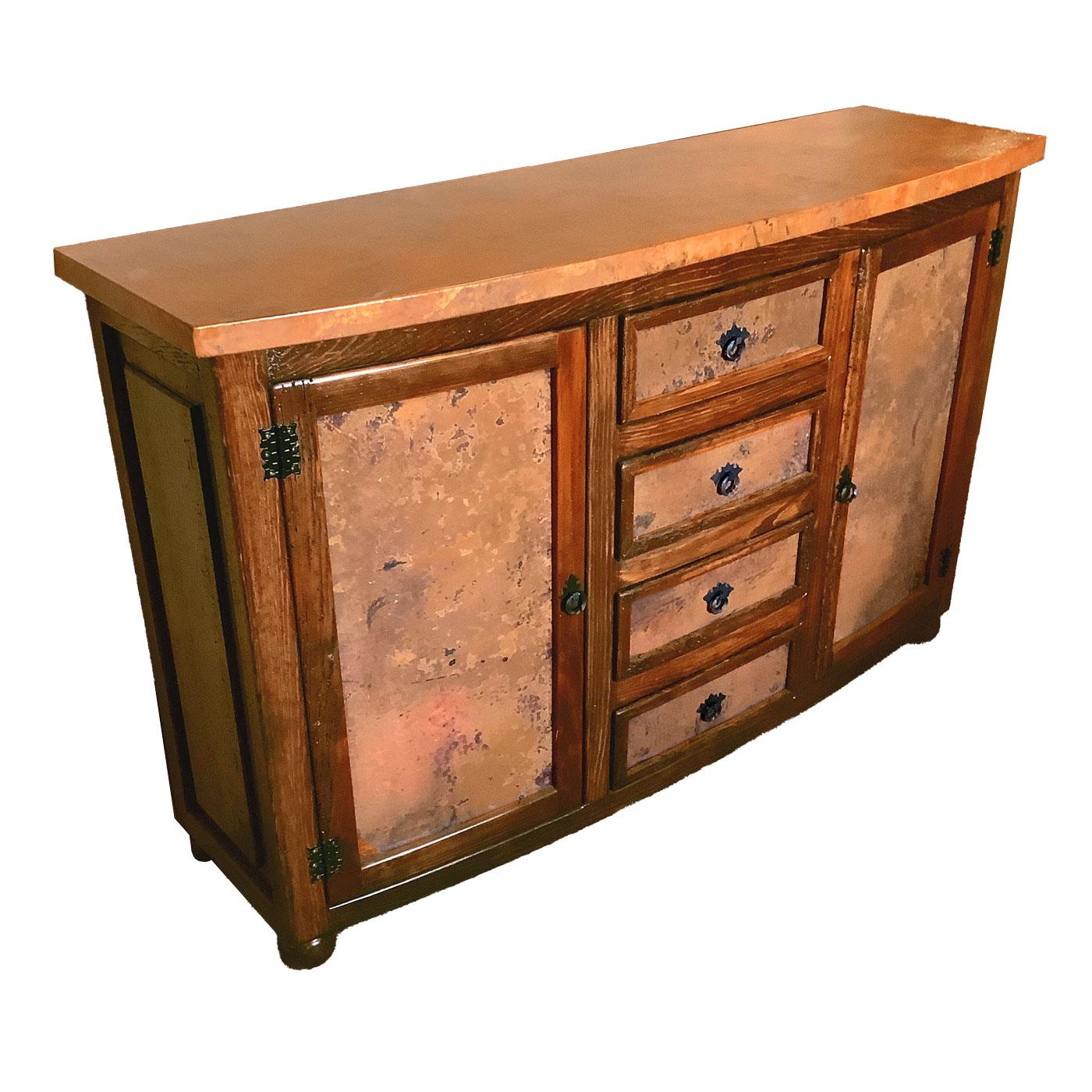 The Curved Console features a unique rounded design with gorgeous copper door and drawer fronts. This console table will highlight any room of your home and provides excellent storage space, too. Use this console table for extra storage in your living room, dining room, bedroom or hallway.