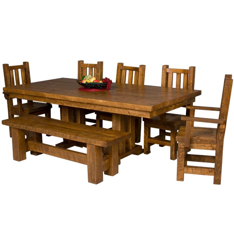 The Barnwood Trestle Dining Table is a stunning design that will draw attention to any rustic dining area. These tables are impressive and very durable. The table tops are constructed by gluing pieces of two inch rough sawed pine together. The table legs are made from four inch by four inch rough sawed pine timbers and are tucked under the center area of the table to allow chairs and benches to be completely pushed under the table when not being used. The barn wood trestle style table is built completely from rough sawed pine timbers to replicate the barn wood look at an affordable price.