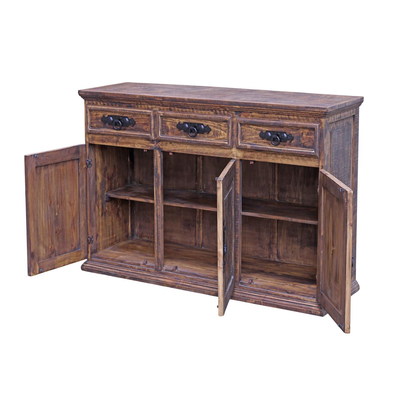 Three 20-inch cabinets and three drawers provide you with plenty of storage space in the beautiful and affordable Small Stirrup Credenza. It can be placed along a wall in any room or entry area. Made in Mexico by skilled craftsmen, this lovely Small Stirrup Credenza is built of solid pine, and adorned with hand-forged matte black pulls.