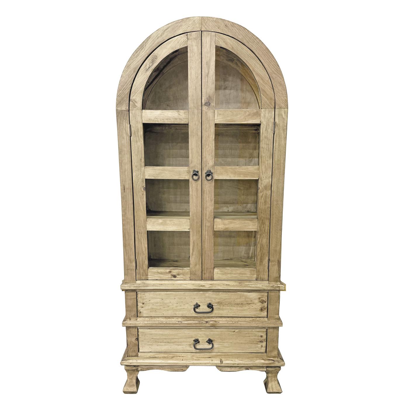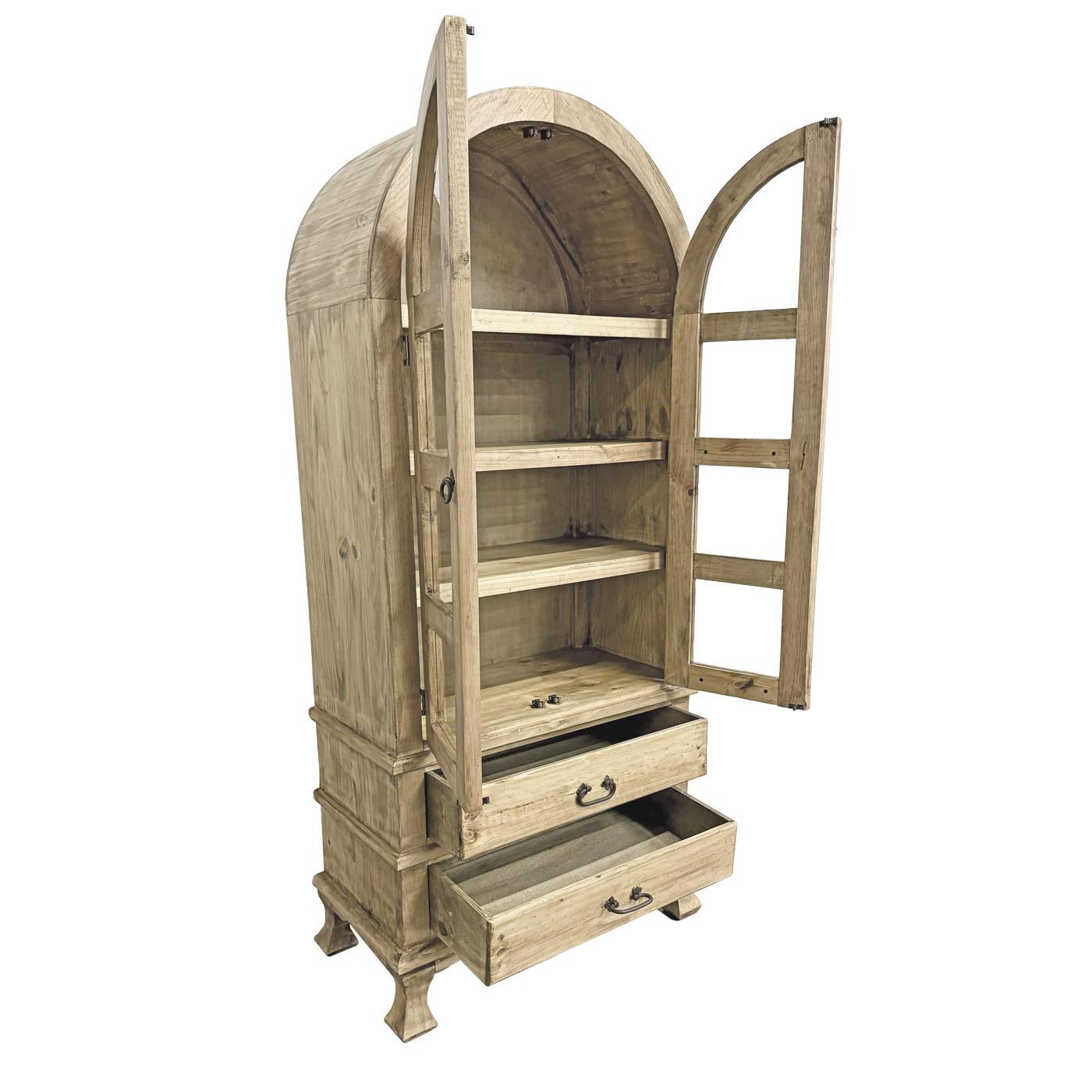 Our attractive Arched Top Cupboard has a classic southwestern style with plenty of available storage space for personal effects. The glass-paneled doors will keep your dishes, books or collectibles dust-free. The iron hardware gives it a rustic look that blends well with most decor. The two bottom drawers provide extra space for items less worthy of display. Its sturdy construction can be used in any room for storage or display. Skillfully handmade in Mexico, you will fall in love with the solid pine construction of our Arched Top Cupboard.