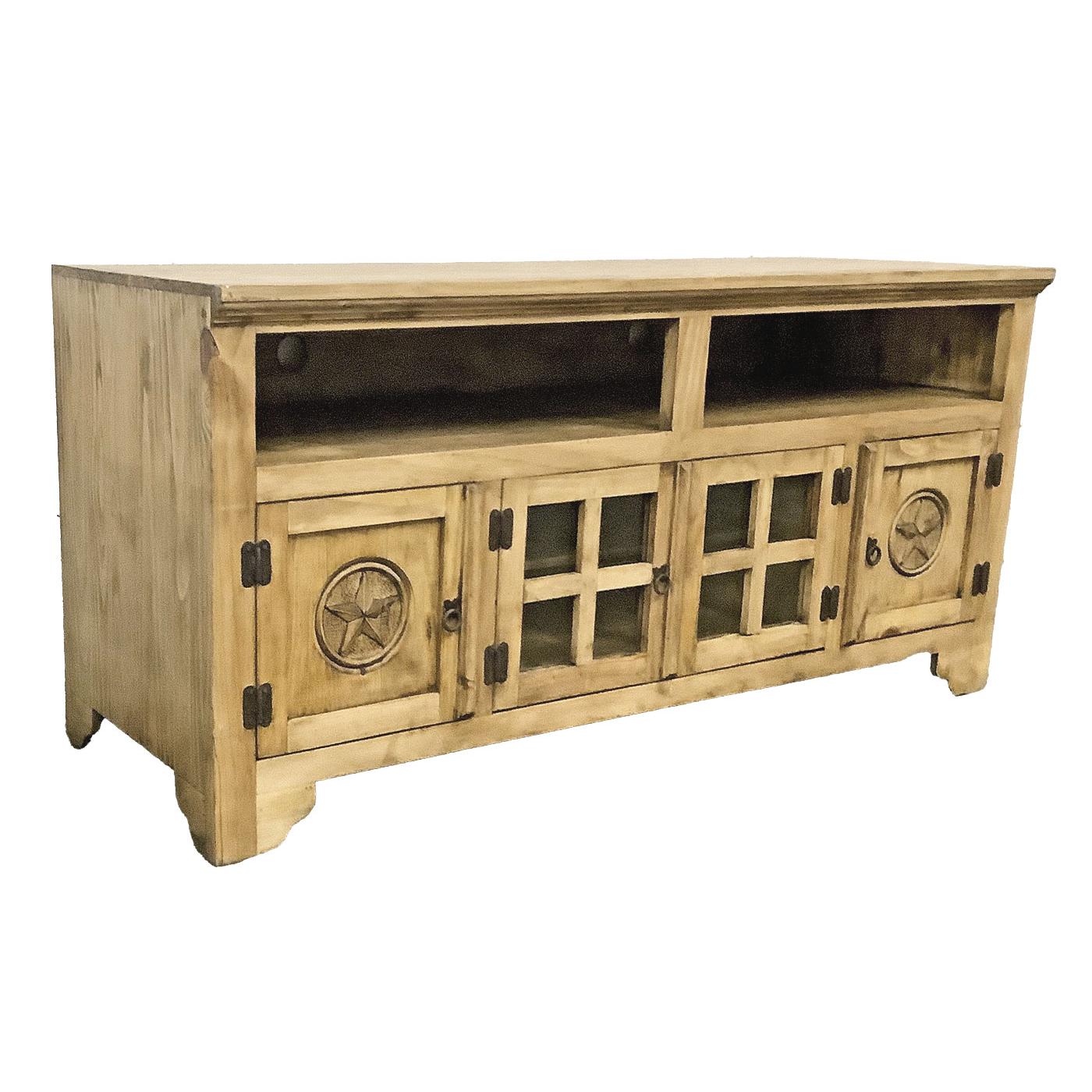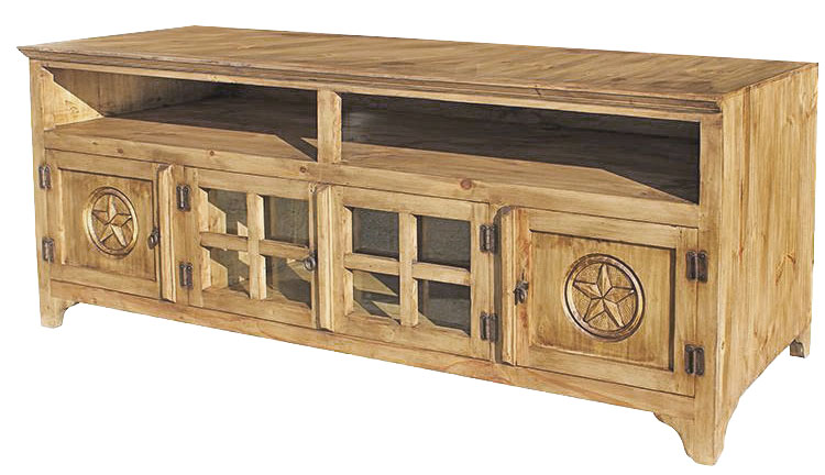 Our Texas TV Stand features four spacious bottom cabinets with two glass and two beveled wood doors with hand-carved star emblems. The large open shelf is ideal for your cable box, game consoles and media players with pre-cut cable management ports in the back panel. Tall accent legs and rustic iron hardware complete the rustic look of the solid pine Texas TV Stand. Expertly handmade in Mexico, both glass door panels are included.