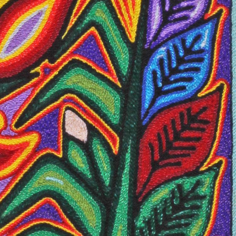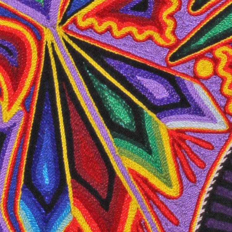 This beautiful, one-of-a-kind yarn painting was made by pressing thin strands of acrylic yarn into natural beeswax spread over a wooden board. Yarn art is made in limited quantities by the Huichol and Tepehuano people of southwestern Mexico. On the back of each painting is a description of the work, written in Spanish by artist Felix Bautista Ramos.