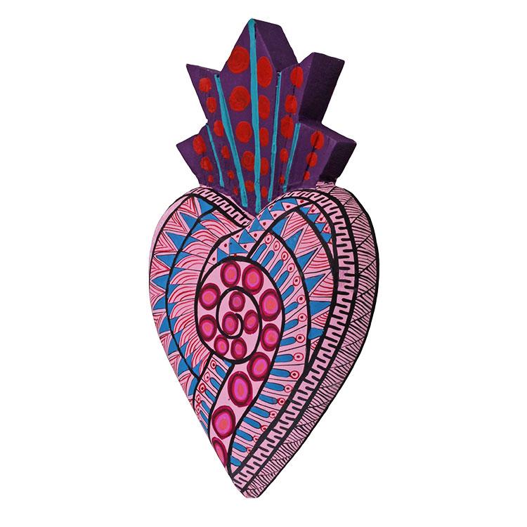 Handmade in the Zapotec village of San Martin, Oaxaca, these beautifully painted wooden hearts reflect the cultural fusion of the artists. Highly detailed with a semi gloss finish, each of these gorgeously carved hearts is adorned with delicate "grecas" like those found at the Zapotec palace of Mitla. The grecas, a series of repeating geometric designs, symbolize pre-Columbian gods like Quetzalcóatl, Tláloc or Cosijo, essential elements like the sun, rain or lightning, and elements of humanity like fertility or knowledge. They also symbolize universal consciousness, and as such, represent the bond between human existence and the divine in pre-Columbian Mexico. It is the shape of the sacred heart, in turn, with it's crown and flames, that demonstrates the fusion of indigenous and Catholic beliefs.