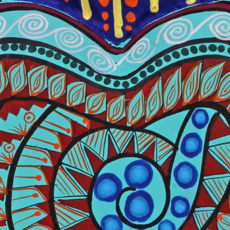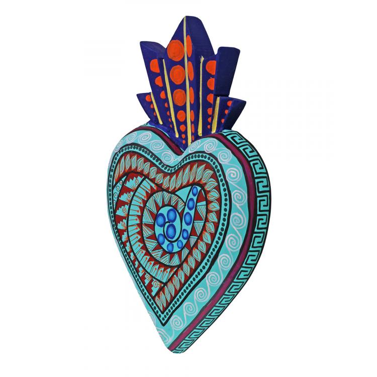 Handmade in the Zapotec village of San Martin, Oaxaca, these beautifully painted wooden hearts reflect the cultural fusion of the artists. Highly detailed with a semi gloss finish, each of these gorgeously carved hearts is adorned with delicate "grecas" like those found at the Zapotec palace of Mitla. The grecas, a series of repeating geometric designs, symbolize pre-Columbian gods like Quetzalcóatl, Tláloc or Cosijo, essential elements like the sun, rain or lightning, and elements of humanity like fertility or knowledge. They also symbolize universal consciousness, and as such, represent the bond between human existence and the divine in pre-Columbian Mexico. It is the shape of the sacred heart, in turn, with it's crown and flames, that demonstrates the fusion of indigenous and Catholic beliefs.