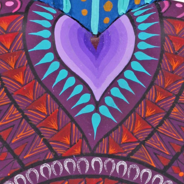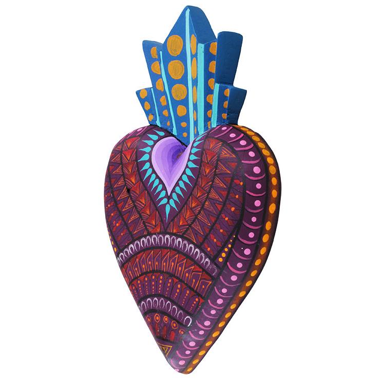 Handmade in the Zapotec village of San Martin, Oaxaca, these beautifully painted wooden hearts reflect the cultural fusion of the artists. Highly detailed with a semi gloss finish, each of these gorgeously carved hearts is adorned with delicate "grecas" like those found at the Zapotec palace of Mitla. The grecas, a series of repeating geometric designs, symbolize pre-Columbian gods like Quetzalcóatl, Tláloc or Cosijo, essential elements like the sun, rain or lightning, and elements of humanity like fertility or knowledge. They also symbolize universal consciousness, and as such, represent the bond between human existence and the divine in pre-Columbian Mexico. It is the shape of the sacred heart, in turn, with it's crown and flames, that demonstrates the fusion of indigenous and Catholic beliefs.