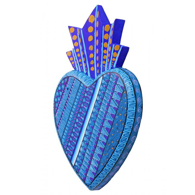 Handmade in the Zapotec village of San Martin, Oaxaca, these beautifully painted wooden hearts reflect the cultural fusion of the artists. Highly detailed with a semi gloss finish, each of these gorgeously carved hearts is adorned with delicate "grecas" like those found at the Zapotec palace of Mitla. The grecas, a series of repeating geometric designs, symbolize pre-Columbian gods like Quetzalcóatl, Tláloc or Cosijo, essential elements like the sun, rain or lightning, and elements of humanity like fertility or knowledge. They also symbolize universal consciousness, and as such, represent the bond between human existence and the divine in pre-Columbian Mexico. It is the shape of the sacred heart, in turn, with it's crown and flames, that demonstrates the fusion of indigenous and Catholic beliefs.
