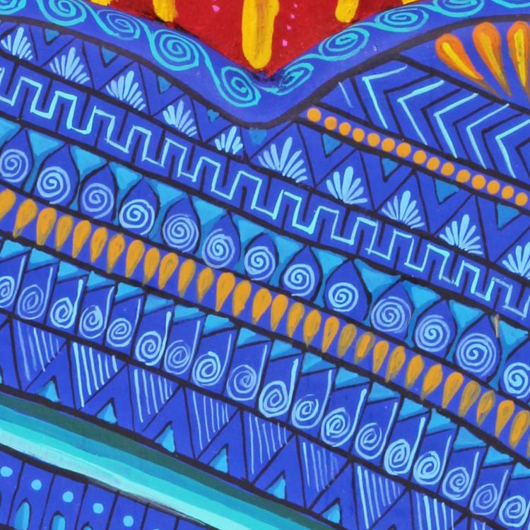 Handmade in the Zapotec village of San Martin, Oaxaca, these beautifully painted wooden hearts reflect the cultural fusion of the artists. Highly detailed with a semi gloss finish, each of these gorgeously carved hearts is adorned with delicate "grecas" like those found at the Zapotec palace of Mitla. The grecas, a series of repeating geometric designs, symbolize pre-Columbian gods like Quetzalcóatl, Tláloc or Cosijo, essential elements like the sun, rain or lightning, and elements of humanity like fertility or knowledge. They also symbolize universal consciousness, and as such, represent the bond between human existence and the divine in pre-Columbian Mexico. It is the shape of the sacred heart, in turn, with it's crown and flames, that demonstrates the fusion of indigenous and Catholic beliefs.