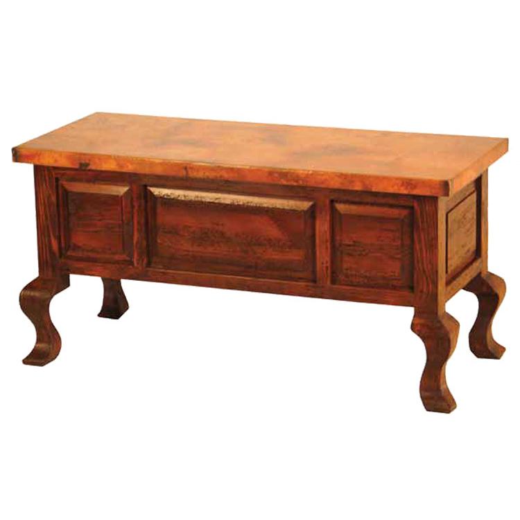 This Bowie Desk is a great compact desk and the fine hammered copper top allows even pencil to be used without worry. Sure to become the focal point of any room, the desk features uniquely carved legs, three side drawers for storage, and a large middle pencil drawer. The back is also finished for center room placement if desired.