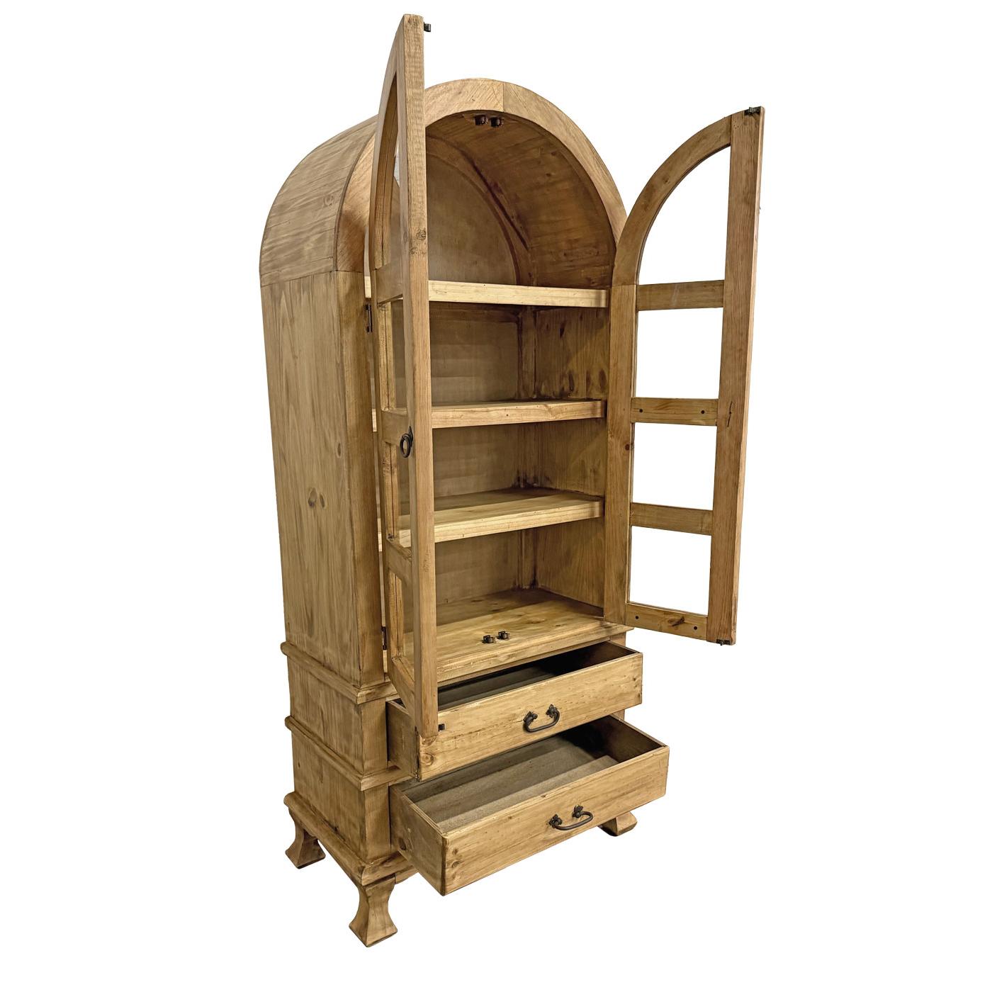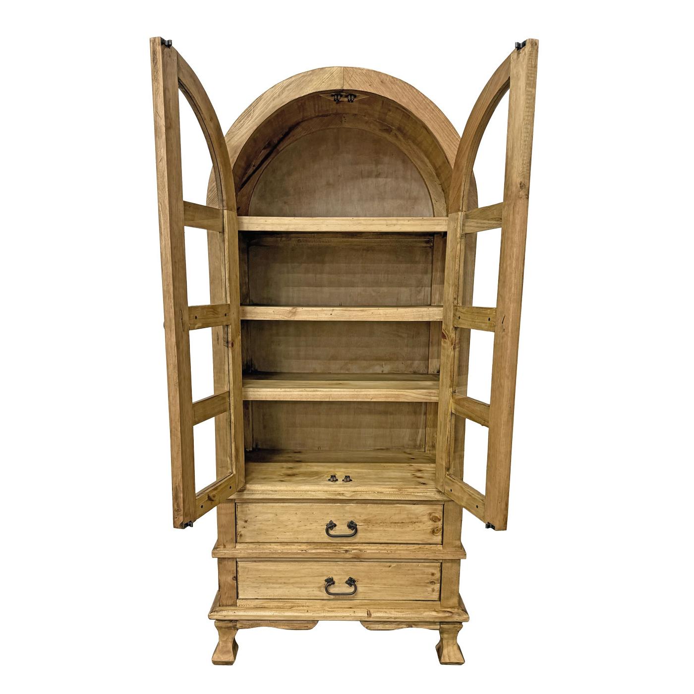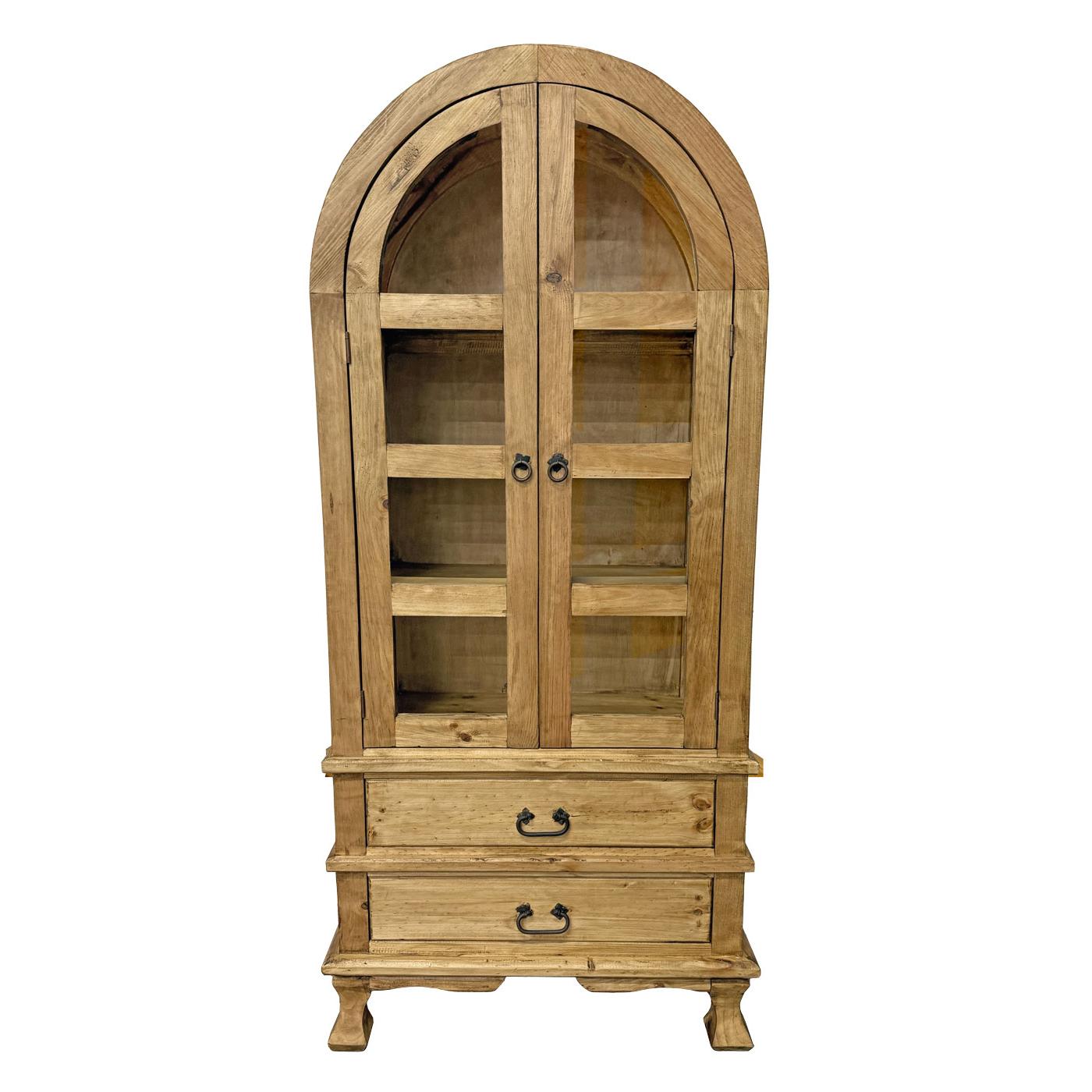 Our attractive Arched Top Cupboard has a classic southwestern style with plenty of available storage space for personal effects. The glass-paneled doors will keep your dishes, books or collectibles dust-free. The iron hardware gives it a rustic look that blends well with most decor. The two bottom drawers provide extra space for items less worthy of display. Its sturdy construction can be used in any room for storage or display. Skillfully handmade in Mexico, you will fall in love with the solid pine construction of our Arched Top Cupboard.