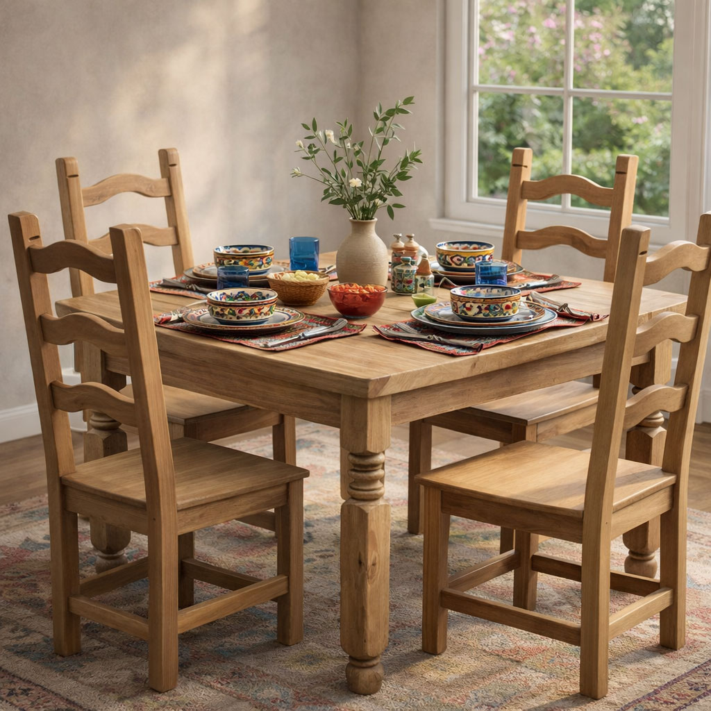 Skillfully made in Mexico, our Square Lyon Dining Set will comfortably seat 4 adults.