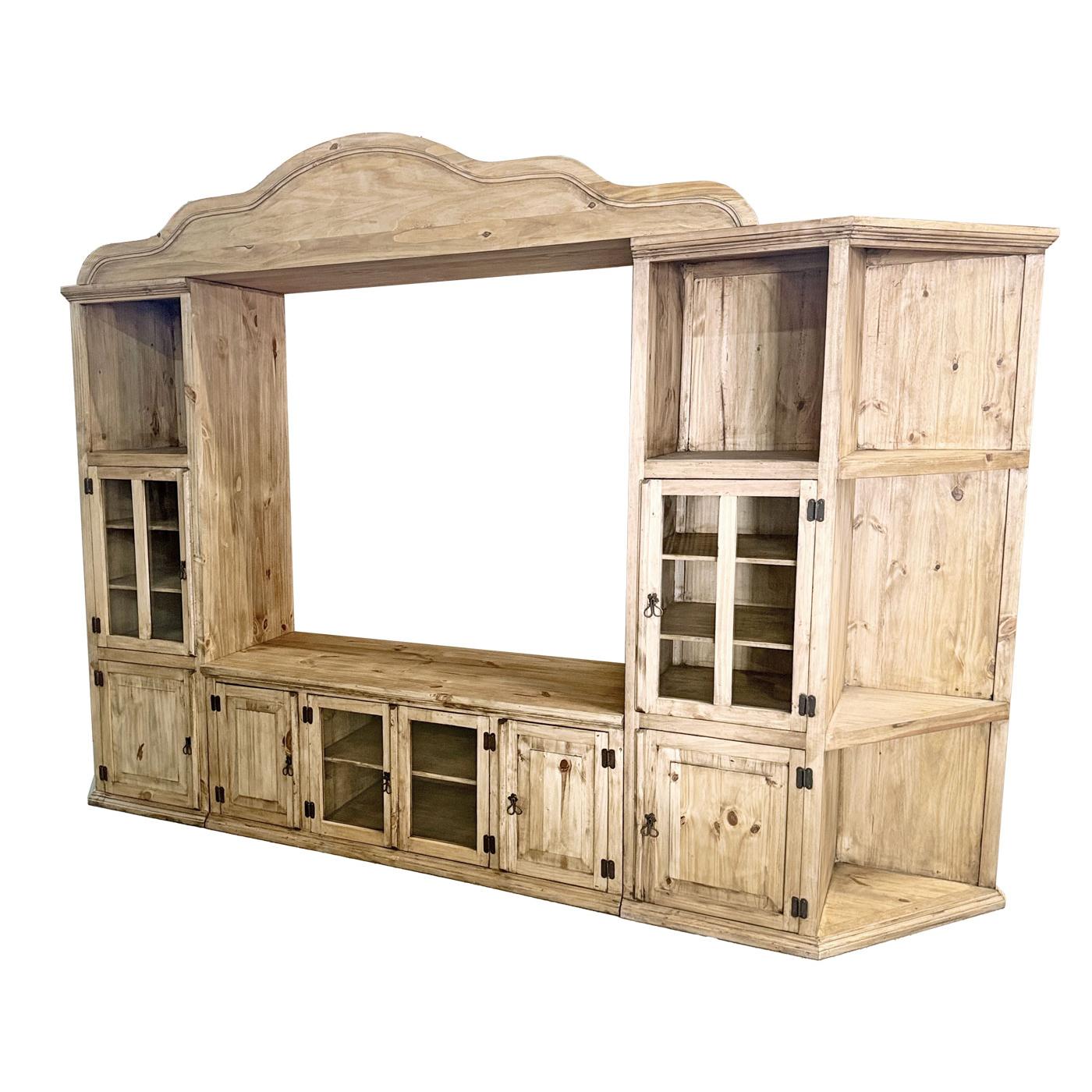 A wall of storage is at your fingertips with our 4-Piece Maria Entertainment center. The TV Stand provides a 60-inch space for your television, and includes a four-door cabinet with ample shelving for all your audio-visual and gaming gear. The two sloping side towers will add a clean, built-in look to your living room, and they provide deep storage for DVDs, books, speakers and more. The fine workmanship is evident in the extra-large bonnet top and distressed finish. This rustic style goes well with many other decor types, and both glass door panels are included.