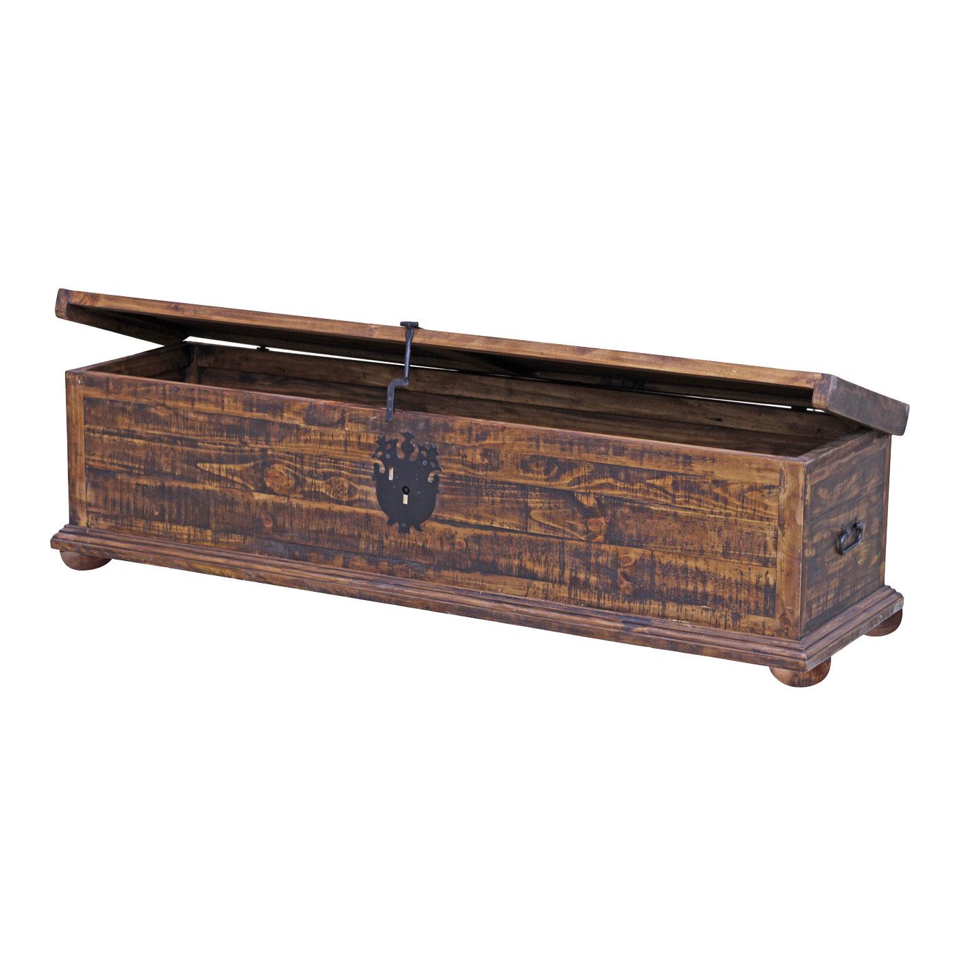 If you want a lot of storage that can double as an accent table or bench, our King Ranch Trunk w/ Feet might be perfect for you. Intended for use at the foot of a king-size bed, it's also perfect as a coffee table or large bench. A versatile, southwestern style furniture piece that fits well with most casual decor, place this trunk in front of a sofa bed and you can store bedding and blankets inside. In front of a wide window, it's ideal as an area for displaying flowering and indoor plants. Handmade from solid pine in Mexico, the King Ranch Trunk w/ Feet is accented by durable hand-forged iron hardware and completed with a distressed rustic finish.