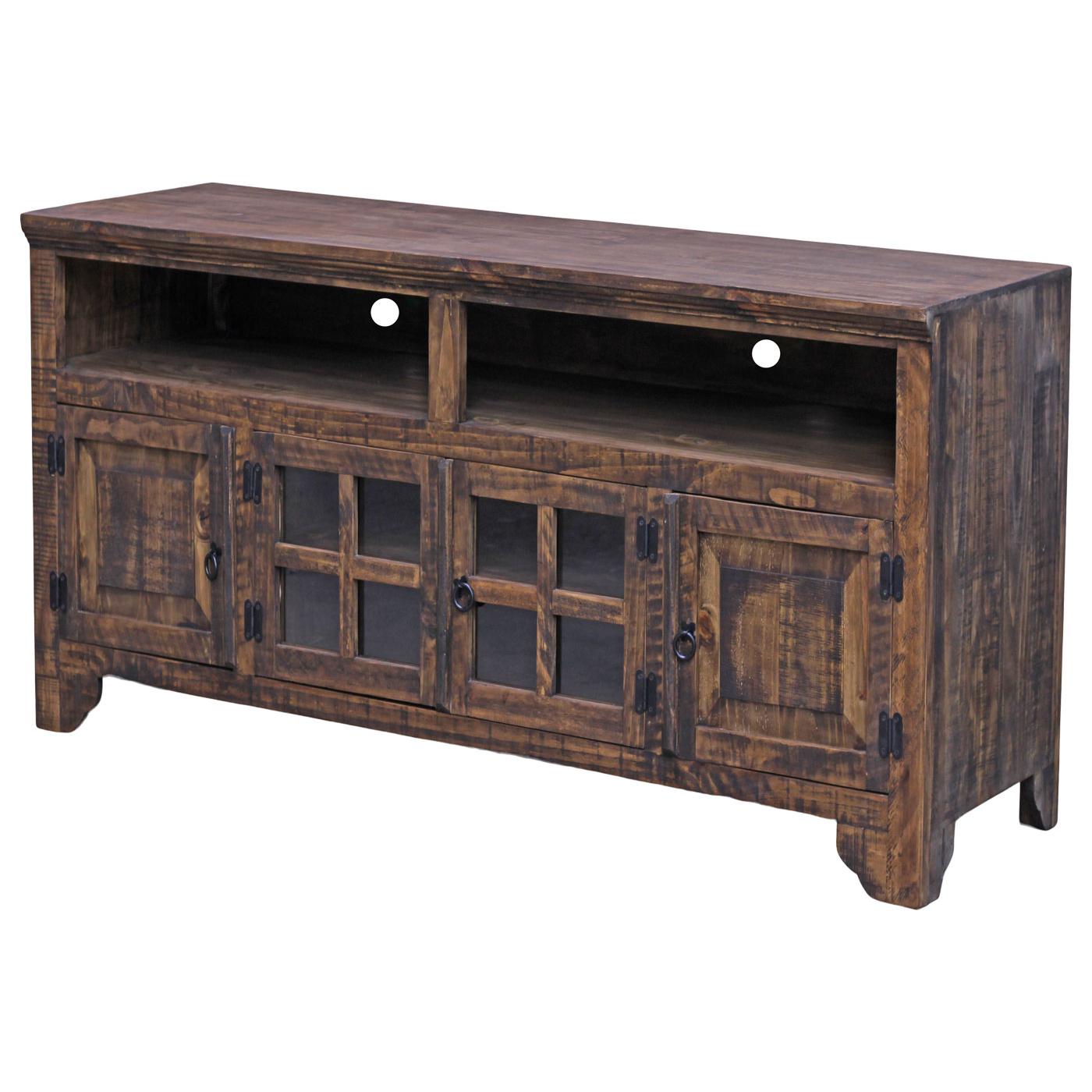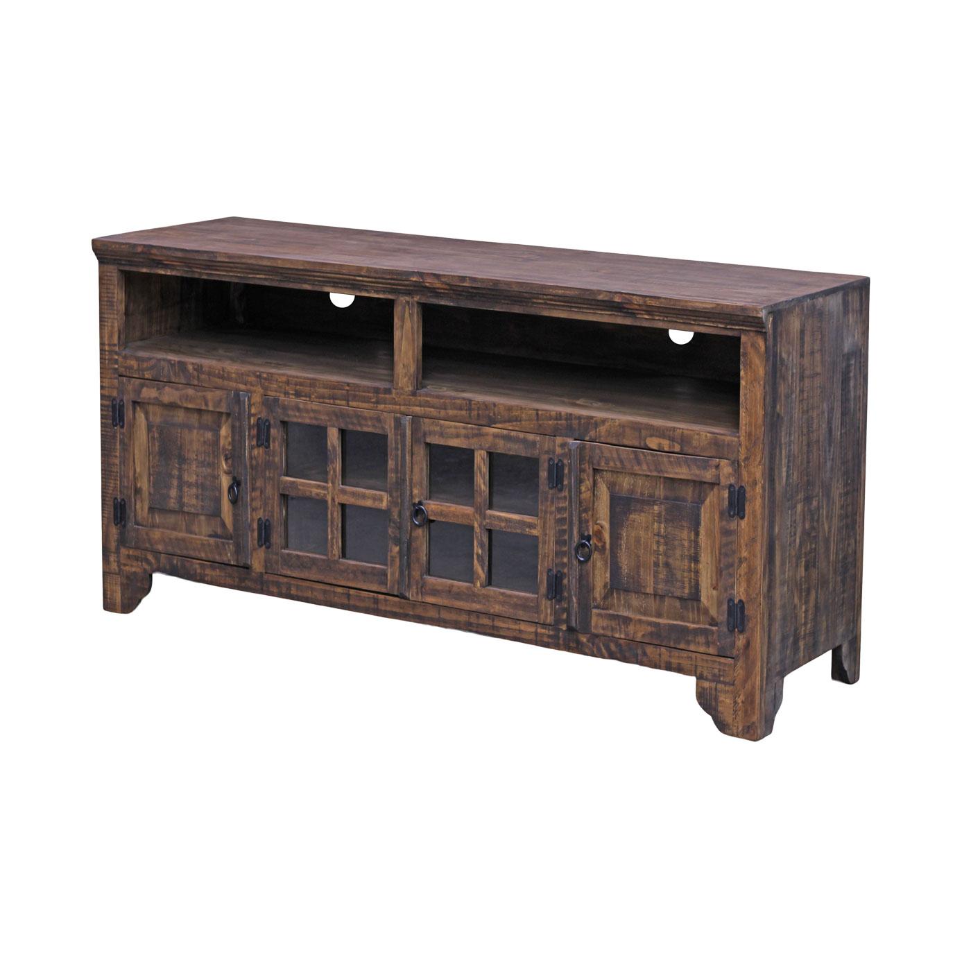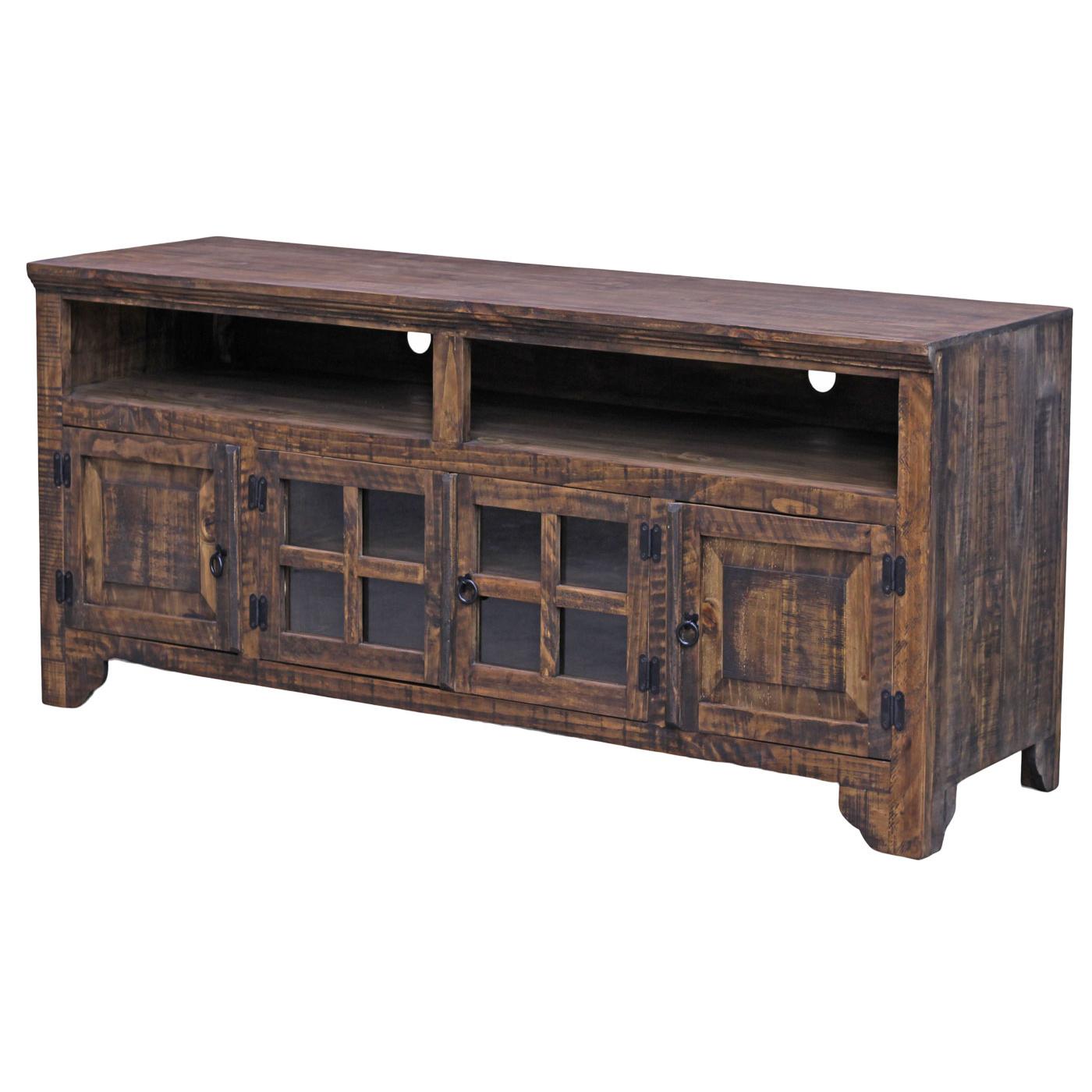 Our Holliday TV Stand features four spacious cabinets with two glass and two beveled wood doors. The large open shelving is ideal for your cable box, game consoles and media players with pre-cut cable management ports in the back panel. Rounded accent legs, warm distressed finish and matte black hardware complete the southwestern look of the solid pine Holliday TV Stand. Expertly handmade in Mexico.