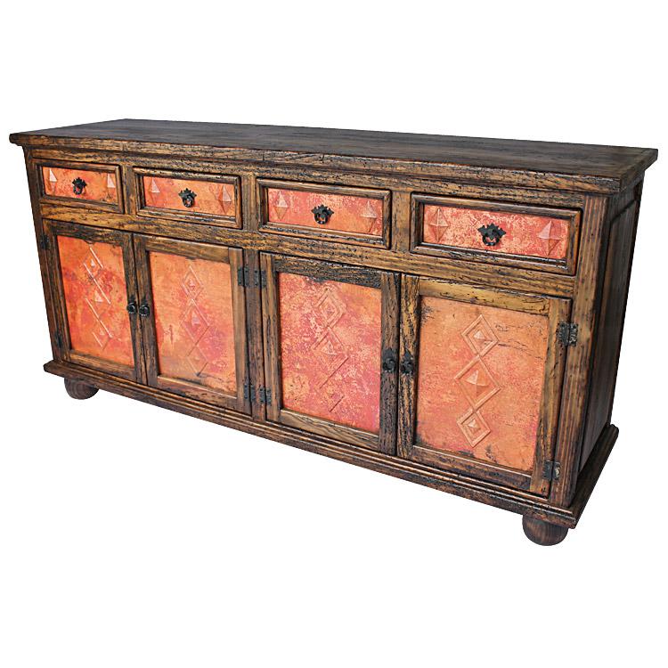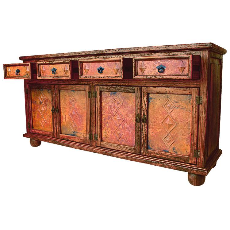 This sideboard features four storage drawers and four cabinet doors with front facing copper panels and rustic hardware. Use this sideboard for extra storage in your dining room, bedroom, or any room of your house. This sideboard is the perfect combination of form and function. Add storage and style to any room with this rustic copper sideboard.