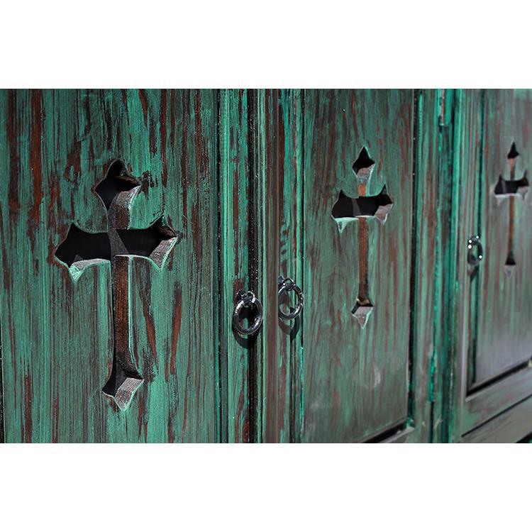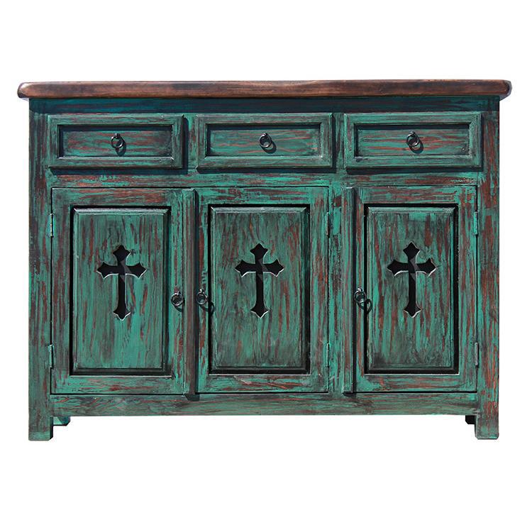 Beautiful, solid pine construction makes this buffet a welcomed addition to any home decor. With carved out crosses on the doors this beautiful buffet will sure to the center piece of your collection. With three doors and three drawers the spacious cabinets of the buffet will hold all of your dining room items and hide away larger kitchen utensils. This small buffet is perfect for entertaining in smaller areas.